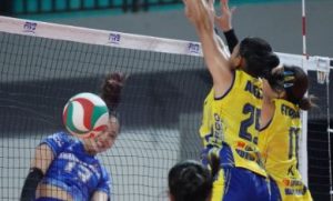 Pukulan keras Calista Maya berhasil menyeberangkan bola meski dikawal dua atlet tim Kota Impian Wahana. Foto: Humas.