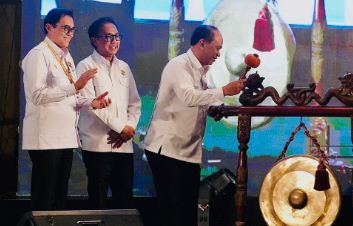 Menteri Koperasi Budi Arie Setiadi memukul gong sebagai tanda pembukaan Rapimnas Dewan Koperasi Indonesia di The Sultan Hotel, Jakarta, Senin (26/5/2025). Foto: Humas Kemenkop.