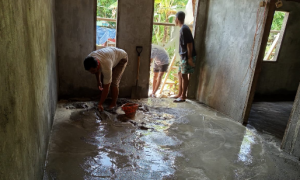 Personel TMMD Ke-127 Kodim 1514/Morotai mengerjakan flur lantai Rumah Tidak Layak Huni di Desa Mandiri, Kecamatan Morotai Selatan, Maluku Utara. Foto: Pendim 1514/Morotai.