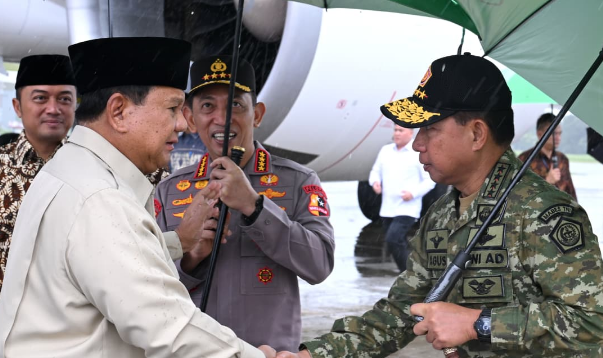 Panglima TNI Jenderal TNI Agus Subiyanto menyambut kedatangan Presiden Prabowo Subianto di Pangkalan TNI AU Halim Perdanakusuma, Jakarta. Foto: BPMI Setpres/Kris.