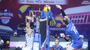Pemain anyar putri Bandung bjb Tandamata Giulia Angelina melancarkan spike-nya dan menembus hadangan dua atlet Medan Falcons. Foto: Humas.