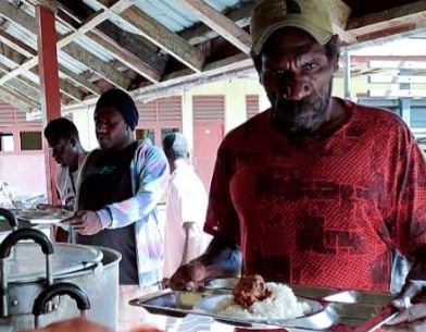 Masyarakat atau warga yang memanfaatkan dapur lapangan di Kampung Pigapu, Papua Tengah untuk mendapat bantuan makanan guna meningkatkan kesejahteraan masyarakat. Foto: Pendim 1710/Mimika.